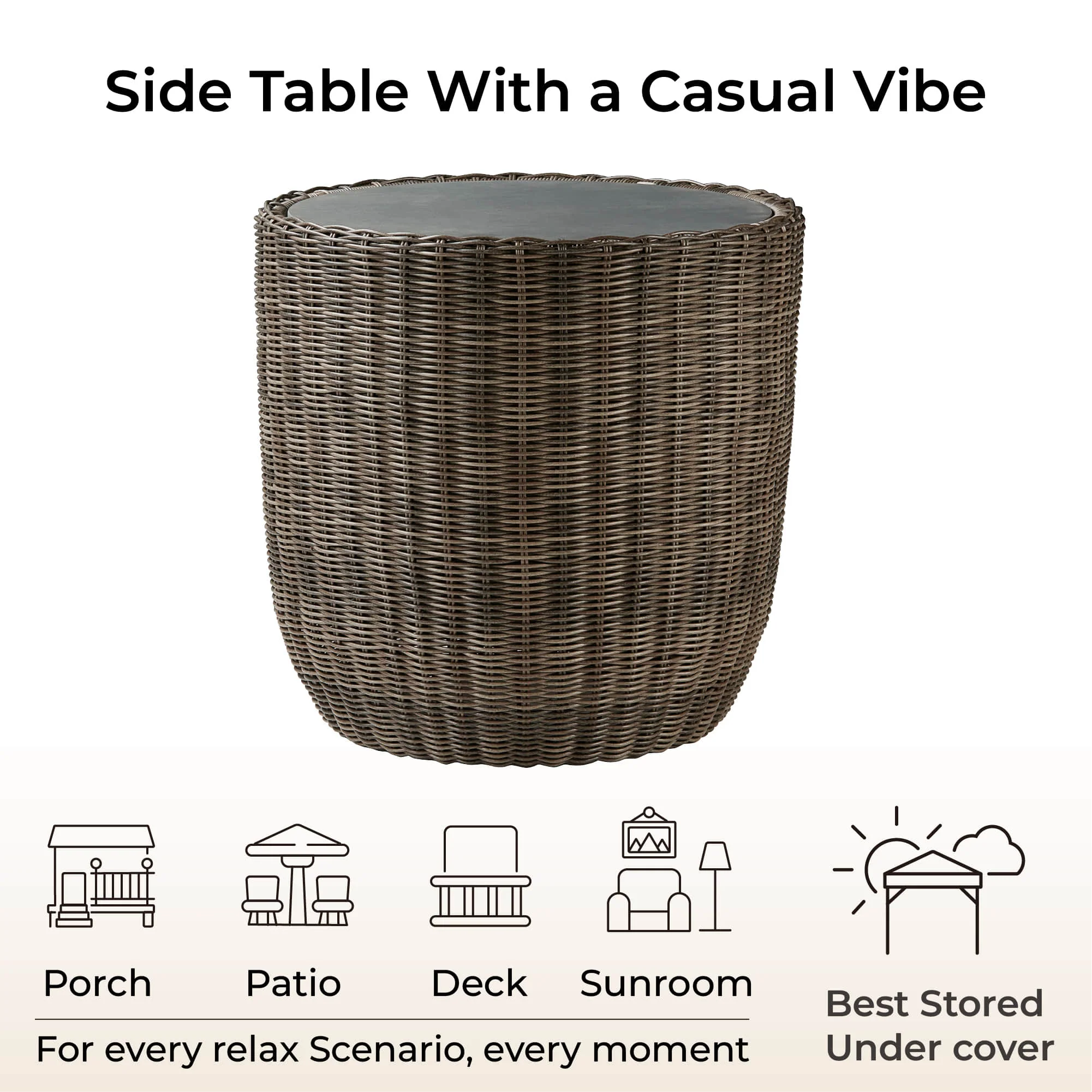 LIANA SIDE TABLE WITH A CASUAL VIBE - This side table features a casual and relaxing look. Low-profile silhouettes are meticulously handwoven by skilled artisans with all-weather resin wicker and power coated heavy duty steel frame. Each piece is unique and and its own beauty. This set is a versatile addition to any outdoor space and is perfect for sunroom, patio or deck.