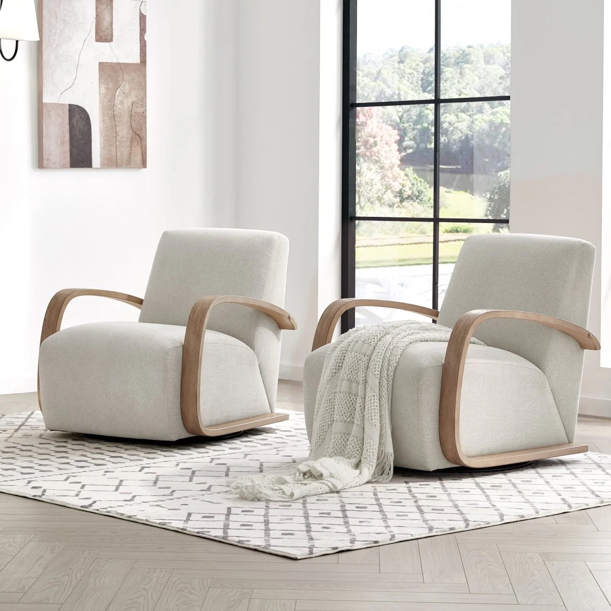 Stylish Comfort, Sophisticated Design: Lean into the dramatically shaped seating style of this swivel chair. U-shaped arms of solid wood with oak veneer wraps around the entire silhouette for an intriguing takeaway. From its waterfall seat to its smooth swivel base, this chair offers ultimate comfort for everyday living and is a perfect accent to any living space.