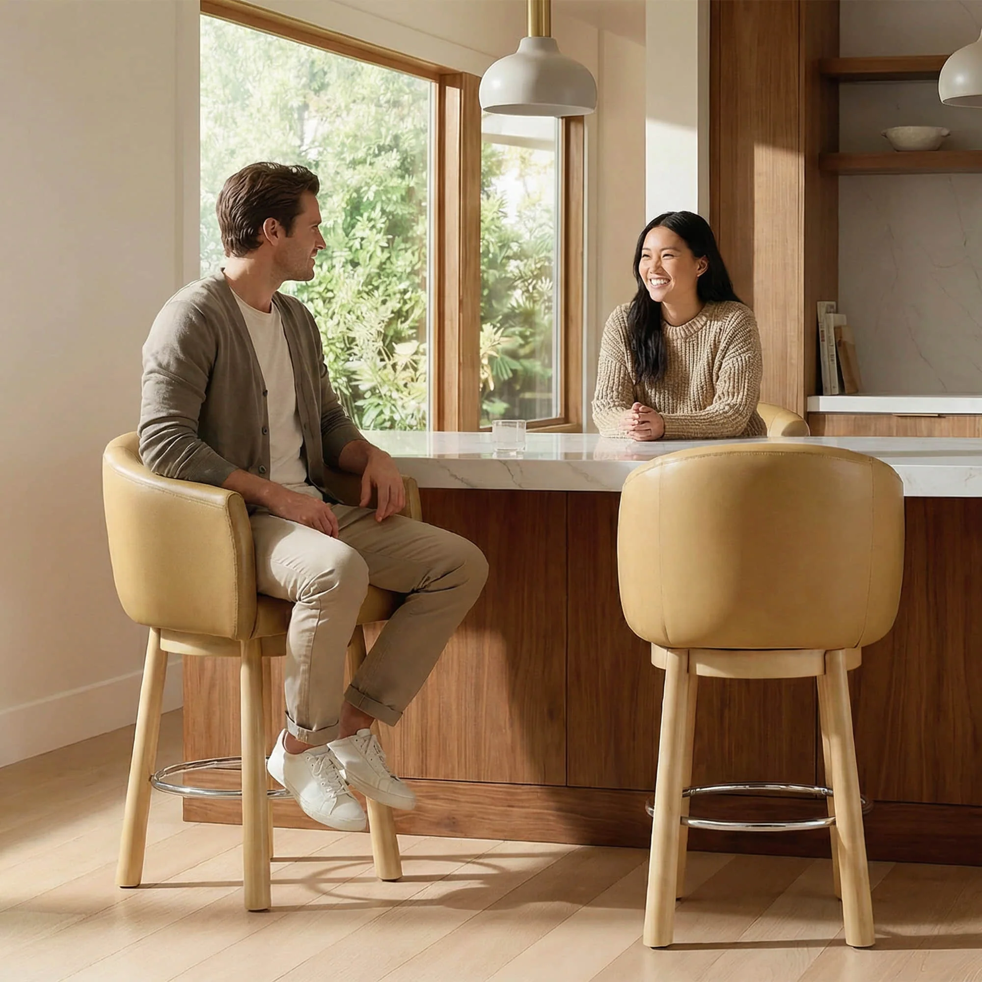 Wrapped in luxurious genuine leather that's soft to the touch and easy to clean, this swivel bar stool offers both elegance and practicality. The enveloping barrel back and plush armrests provide exceptional comfort, while high-resilience foam ensures lasting support through any gathering. A smooth 360° swivel mechanism allows effortless movement. Below, a boldly turned solid wood base—inspired by classic elephant leg styling—delivers striking presence and robust stability. Thoughtful details include a protective footrest and adjustable glides for a wobble-free fit on any floor. Timeless craftsmanship, refined for modern living.